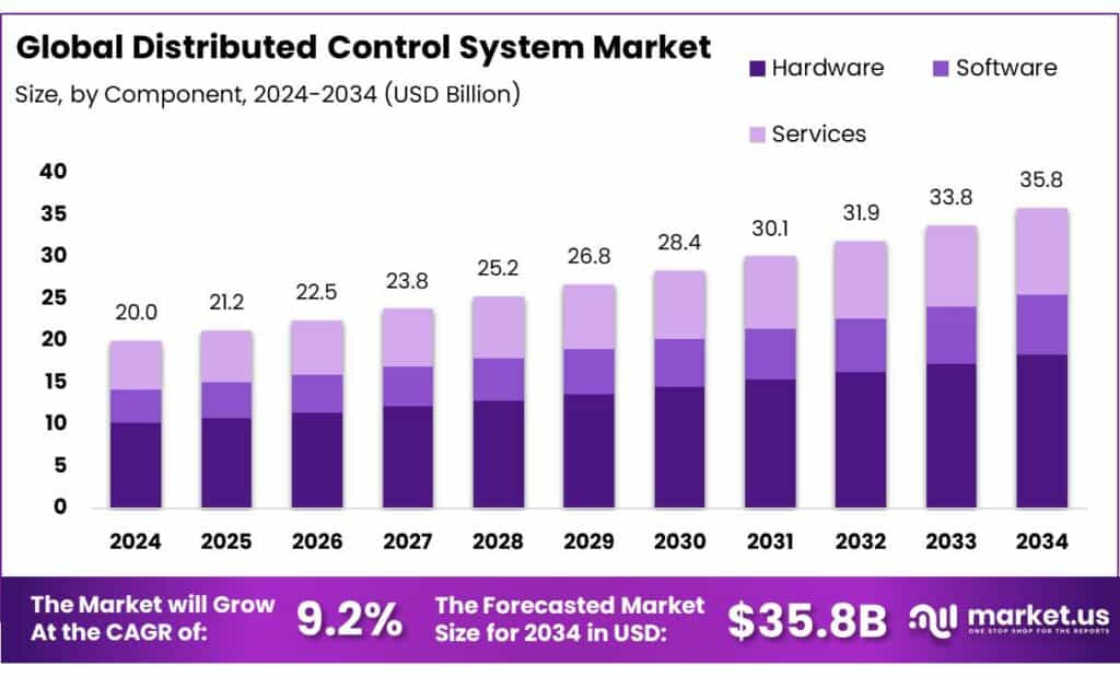 The Global Distributed Control System (DCS) Market is anticipated to experience substantial growth, projected to reach USD 35.8 billion by 2034, up from USD 20 billion in 2024. This growth represents a CAGR of 9.2% from 2025 to 2034. DCS plays a critical role in automating industrial processes, particularly in sectors like manufacturing, energy, oil and gas, and utilities, by providing real-time control and monitoring across various operations. The ongoing adoption of Industry 4.0 technologies, advancements in automation, and rising demand for operational efficiency are key factors driving the market’s expansion. This trend is supported by increasing investments in infrastructure and industrial upgrades worldwide.
