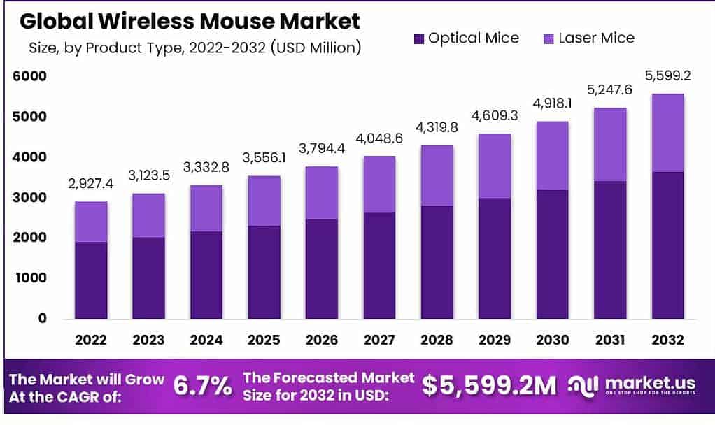 The 6.7% CAGR in the wireless mouse market reflects a broader trend of increasing consumer and business reliance on wireless technology and portable computing devices. As companies and individuals move towards wireless solutions for greater flexibility and convenience, demand for wireless peripherals, including mice, is expected to grow. This expansion is creating jobs in manufacturing, distribution, and retail, while driving innovations in technology.